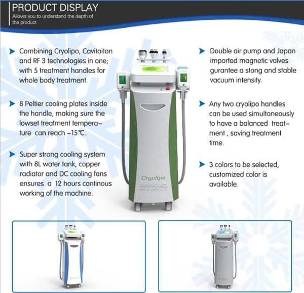 5 handles : two Cryolipolysis handles; two RF handles and one 40K cavitation handle